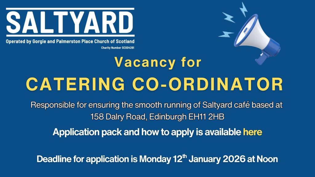 Gorgie and Palmerston Place Church is a new charge formed by the union of two thriving congregations in the west of Edinburgh. The united parish is one of the largest in the city, in terms of both geographical extent and population. Both existing church buildings, on Gorgie Road and on Palmerston Place, have been retained as active worship centres for the new parish. We also have a community café and outreach centre at Saltyard on Dalry Road.